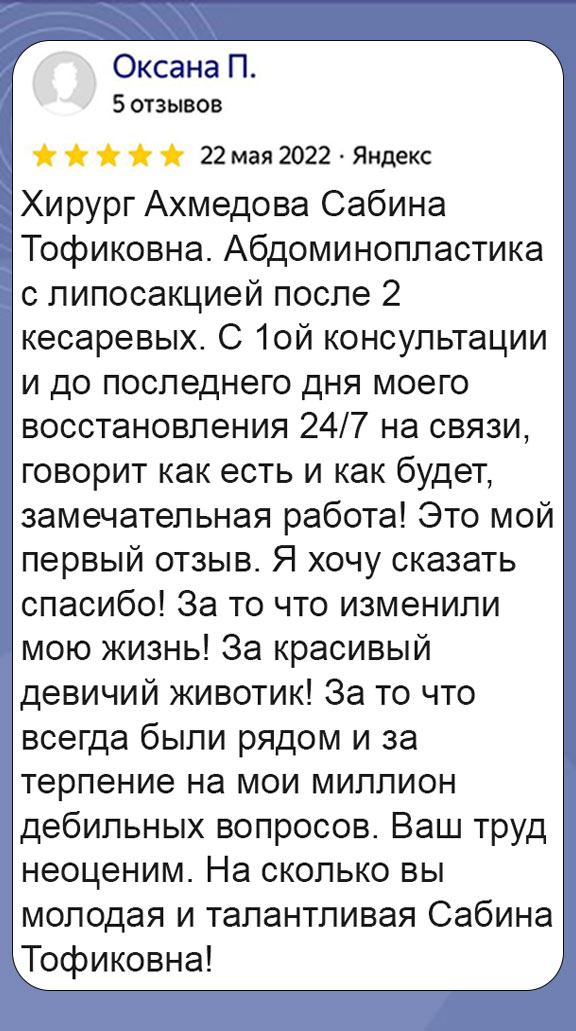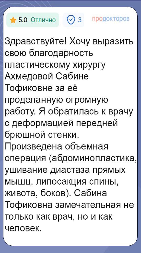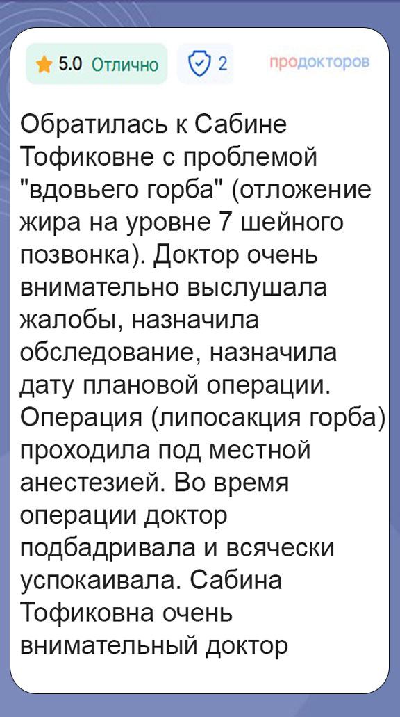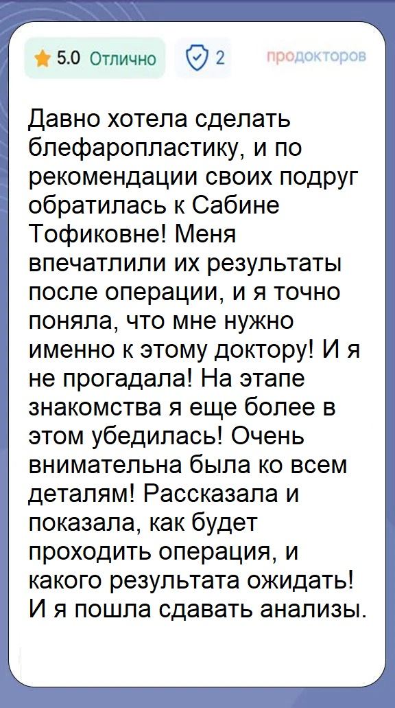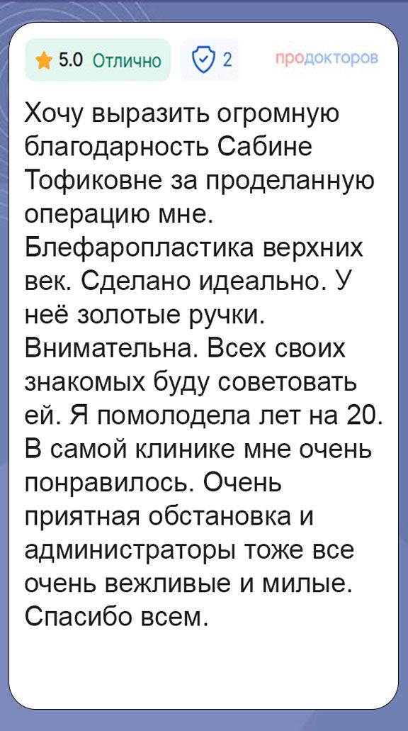 Пластическая хирургия — специальность, которая требует огромной ответственности, стопроцентной вовлеченности и постоянного профессионального роста. Сабина Тофиковна считает свою работу призванием. Она делает операции строго по показаниям и так, чтобы факт хирургического вмешательства впоследствии был не заметен постороннему взгляду. Исправляет эстетические несовершенства и при этом сохраняет природную гармонию, красоту и индивидуальность черт каждого пациента.